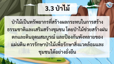 3.3 ป่าไม้ ี่ ป่าไม้เป็นทรัพยากรทสร้างผลกระทบในการสร้าง ธรรมชาตและเสริมสร้างชมชน โดยป่าไม้ช่วยสร้างฝน ุ ิ ู ตกและดนอดมสมบรณ์ และป้องกนพังทลายของ ั ุ ิ แผ่นดน ควรรักษาปาไม้เพอรักษาส่งแวดลอมและ ่ ื ้ ่ ิ ิ ุ ชมชนไดอย่างยั่งยืน ้