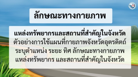 ลกษณะทางกายภาพ ั ั ่ ั ั แหลงทรัพยากรและสถานที่ส าคญในจงหวด ี่ ตวอย่างการใช้แผนทกายภาพจงหวดอตรดตถ ์ ั ั ุ ั ิ ิ ุ ระบตาแหน่ง ระยะ ทศ ลกษณะทางกายภาพ ั ั แหลงทรัพยากร และสถานทส าคญในจงหวด ั ี่ ั ่