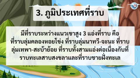 3. ภูมิประเทศที่ราบ ่ มีที่ราบระหวางแนํวเขาสูง 3 แองที่ราบ คอ ่ ื ่ ที่ราบลุมคลองหอยโข่ง ที่ราบลุมนําทวี-จะนํะ ที่ราบ ่ ่ ั ื ่ ่ ่ ลุมเทพา-สะบ้าย้อย ทีราบท้งสามแองตอเนํองกบที ่ ่ ั ่ ราบทะเลสาบสงขลาและทีราบชายฝั ่ งทะเล