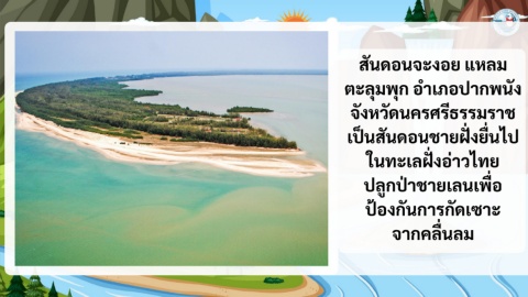 สันดอนจะงอย แหลม ั ตะลุมพุก อาเภอปากพนง ั ั จงหวดนครศรีธรรมราช ื ่ ็ เปนสันดอนชายฝ ่ ังยนไป ่ ในทะเลฝ ่ ังอาวไทย ปลูกป่าชายเลนเพือ ่ ั ั ป้องกนการกดเซาะ จากคลนลม ่ ื