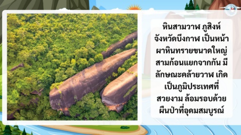 หินสามวาฬ ภูสิงห์ ้ ั ั จงหวดบึงกาฬ เป็นหนา ผาหินทรายขนาดใหญ่ ั สามกอนแยกจากกน มี ้ ้ ลกษณะคลายวาฬ เกด ิ ั เป็นภูมิประเทศที่ ้ สวยงาม ลอมรอบดวย ้ ุ ผืนป่าที่อดมสมบรณ ์ ู