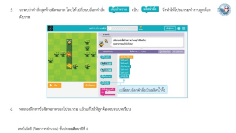 5. จะพบว่าค าสั่งสุดท้ายผิดพลาด โดยให้เปลี่ยนบล็อกค าสั่ง เป็น จึงท าให้โปรแกรมท างานถูกต้อง ดังภาพ 6. ทดลองฝึกหาข้อผิดพลาดของโปรแกรม แล้วแก้ไขให้ถูกต้องจนจบบทเรียน เทคโนโลยี (วิทยาการค านวณ) ชั้นประถมศึกษาปีที่ 6