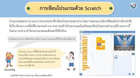 โปรแกรมสแครช (Scratch) สามารถน ามาฝึกเขียนโปรแกรมอย่างง่าย โดยการออกแบบอัลกอริทึมแล้วน าบล็อกค าสั่ง
