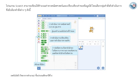 โปรแกรม Scratch สามารถเขียนให้ค านวณค่าทางคณิตศาสตร์และเปรียบเทียบค่าของข้อมูลได้ โดยเลือกกลุ่มค าสั่งตัวด าเนินการ ซึ่งมีบล็อกค าสั่งต่าง ๆ ดังนี้ เทคโนโลยี (วิทยาการค านวณ) ชั้นประถมศึกษาปีที่ 6