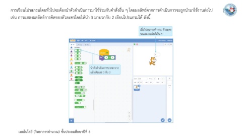 การเขียนโปรแกรมโดยทั่วไปจะต้องน าตัวด าเนินการมาใช้ร่วมกับค าสั่งอื่น ๆ โดยผลลัพธ์จากการด าเนินการจะถูกน ามาใช้งานต่อไป เช่น การแสดงผลลัพธ์การคิดของตัวละครโดยให้น า 3 มาบวกกับ 2 เขียนโปรแกรมได้ ดังนี้ เทคโนโลยี (วิทยาการค านวณ) ชั้นประถมศึกษาปีที่ 6