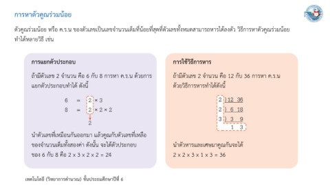ของ 6 กับ 8 คือ 2 x 3 x 2 x 2 = 24 2 x 2 x 3 x 1 x 3 = 36