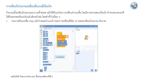 กิจกรรมนี้จะเขียนโปรแกรมแบบวนซ้ าตลอด แล้วใช้ตัวแปรในการเปลี่ยนจ านวนขั้น โดยมีการตรวจสอบเงื่อนไข ถ้าชนขอบของเวที
