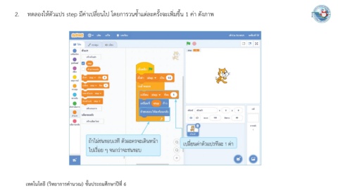 2. ทดลองให้ตัวแปร step มีค่าเปลี่ยนไป โดยการวนซ้ าแต่ละครั้งจะเพิ่มขึ้น 1 ค่า ดังภาพ เทคโนโลยี (วิทยาการค านวณ) ชั้นประถมศึกษาปีที่ 6