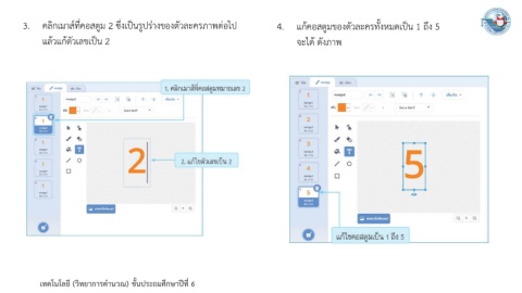 3. คลิกเมาส์ที่คอสตูม 2 ซึ่งเป็นรูปร่างของตัวละครภาพต่อไป 4. แก้คอสตูมของตัวละครทั้งหมดเป็น 1 ถึง 5 แล้วแก้ตัวเลขเป็น 2 จะได้ ดังภาพ เทคโนโลยี (วิทยาการค านวณ) ชั้นประถมศึกษาปีที่ 6