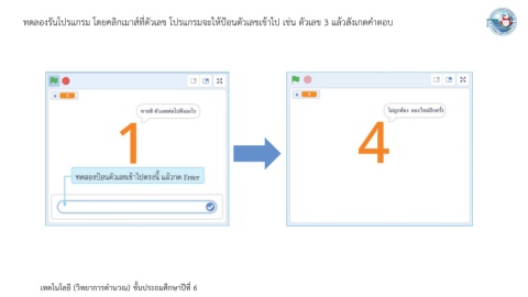 ทดลองรันโปรแกรม โดยคลิกเมาส์ที่ตัวเลข โปรแกรมจะให้ป้อนตัวเลขเข้าไป เช่น ตัวเลข 3 แล้วสังเกตค าตอบ เทคโนโลยี (วิทยาการค านวณ) ชั้นประถมศึกษาปีที่ 6