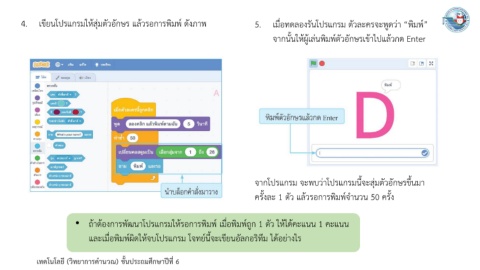 4. เขียนโปรแกรมให้สุ่มตัวอักษร แล้วรอการพิมพ์ ดังภาพ 5. เมื่อทดลองรันโปรแกรม ตัวละครจะพูดว่า “พิมพ์”