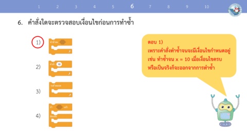 1 2 3 4 5 6 7 8 9 10 6. ค าสั่งใดจะตรวจสอบเงื่อนไขก่อนการท าซ้ า 1) ตอบ 1) เพราะค าสั่งท าซ้ าจนจะมีเงื่อนไขก าหนดอยู่ เช่น ท าซ้ าจน x = 10 เมื่อเงื่อนไขครบ 2) หรือเป็นจริงก็จะออกจากการท าซ้ า 3) 4)