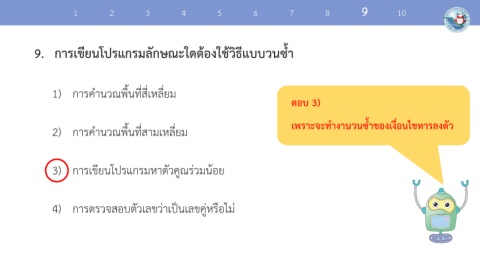 1 2 3 4 5 6 7 8 9 10 9. การเขียนโปรแกรมลักษณะใดต้องใช้วิธีแบบวนซ้ า 1) การค านวณพื้นที่สี่เหลี่ยม ตอบ 3) 2) การค านวณพื้นที่สามเหลี่ยม เพราะจะท างานวนซ้ าของเงื่อนไขหารลงตัว 3) การเขียนโปรแกรมหาตัวคูณร่วมน้อย 4) การตรวจสอบตัวเลขว่าเป็นเลขคู่หรือไม่
