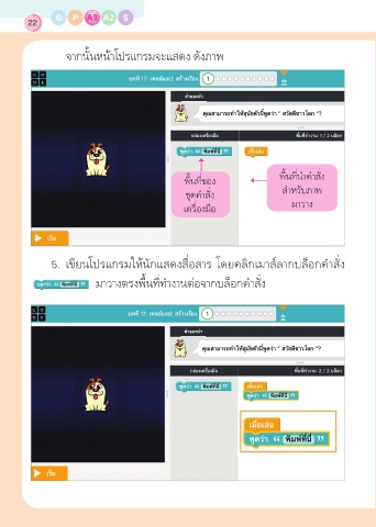 22 G P A1 A2 S A1 จากนั้นหน้าโปรแกรมจะแสดง ดังภาพ ำ พื้นที่ของ พื้นที่นาคำาสั่ง ชุดคำาสั่ง สำาหรับภาพ เครื่องมือ มาวาง 5. เขียนโปรแกรมให้นักแสดงสื่อสาร โดยคลิกเมาส์ลากบล็อกคำาสั่ง มาวางตรงพื้นที่ทำางานต่อจากบล็อกคำาสั่ง
