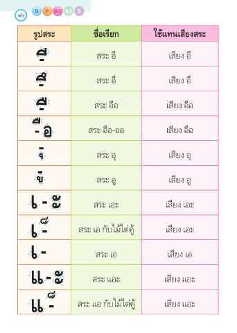 รูปสระ ชื่อเรียก ใช้แทนเสียงสระ
