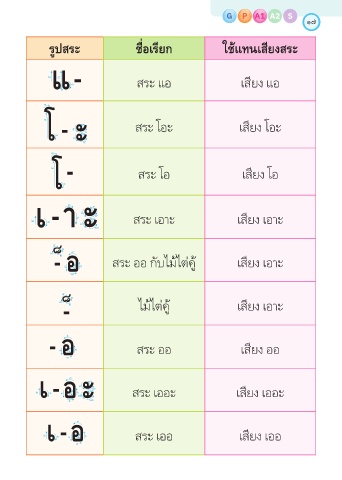P A1 A2 S G G P A1 17 รูปสระ ชื่อเรียก ใช้แทนเสียงสระ สระ แอ เสียง แอ สระ โอะ เสียง โอะ สระ โอ เสียง โอ สระ เอาะ เสียง เอาะ สระ ออ กับไม้ไต่คู้ เสียง เอาะ ไม้ไต่คู้ เสียง เอาะ สระ ออ เสียง ออ สระ เออะ เสียง เออะ สระ เออ เสียง เออ