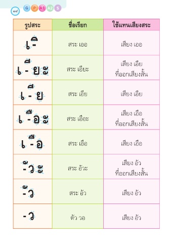 รูปสระ ชื่อเรียก ใช้แทนเสียงสระ