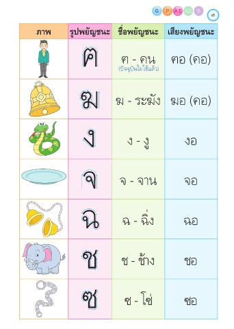 P A1 G G P A1 A2 S 7 ภาพ รูปพยัญชนะ ชื่อพยัญชนะ เสียงพยัญชนะ ฅ - คน ฅอ (คอ) (ปัจจุบันไม่ใช้แล้ว) ฆ - ระฆัง ฆอ (คอ) ง ง - ง งอ จ จ - จาน จอ ฉ - ฉิ่ง ฉอ - ้าง อ - โ ่ อ