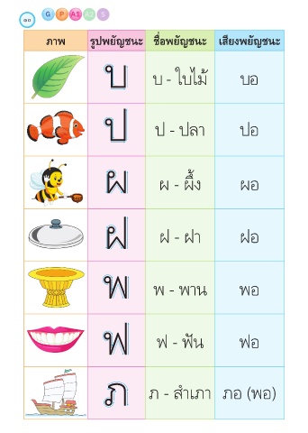 P A1 10 G G P A1 A2 S ภาพ รูปพยัญชนะ ชื่อพยัญชนะ เสียงพยัญชนะ - ใ ไม้ อ - ลา อ ผ ผ - ผึ้ง ผอ ฝ ฝ - ฝา ฝอ พ พ - พาน พอ ฟ ฟ - ฟัน ฟอ ภ ภ - สําเภา ภอ (พอ)