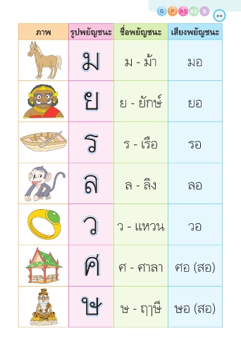 P A1 G G P A1 A2 S 11 ภาพ รูปพยัญชนะ ชื่อพยัญชนะ เสียงพยัญชนะ ม ม - ม้า มอ ย ย - ยัก ์ ยอ ร ร - เรือ รอ ล - ลิง ลอ ว ว - แหวน วอ ศ - ศาลา ศอ (สอ) - ฤๅ ี อ (สอ)