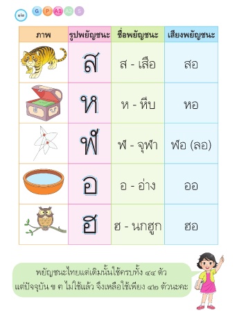 P A1 12 G G P A1 A2 S ภาพ รูปพยัญชนะ ชื่อพยัญชนะ เสียงพยัญชนะ ส - เสือ สอ ห ห - หี หอ ฬ - จุฬา ฬอ (ลอ) อ - อ่าง ออ ฮ - นกฮก ฮอ พยัญชนะไทยแต่เดิมนั้นใช้ครบทั้ง ๔๔ ตัว แต่ปัจจุบัน ฃ ฅ ไม่ใช้แล้ว จึงเหลือใช้เพียง ๔๒ ตัวนะคะ
